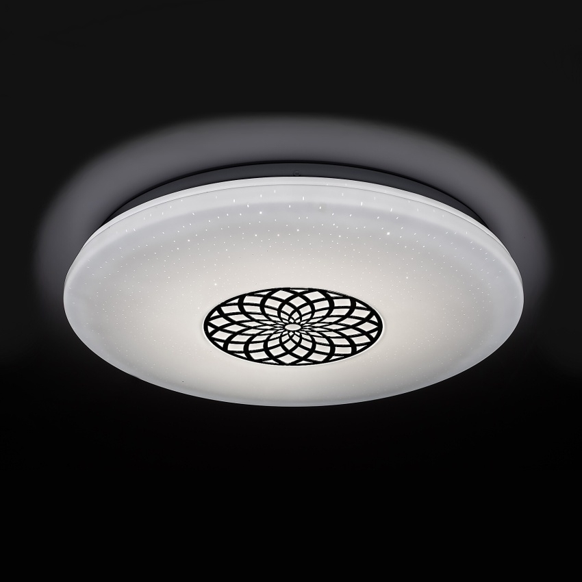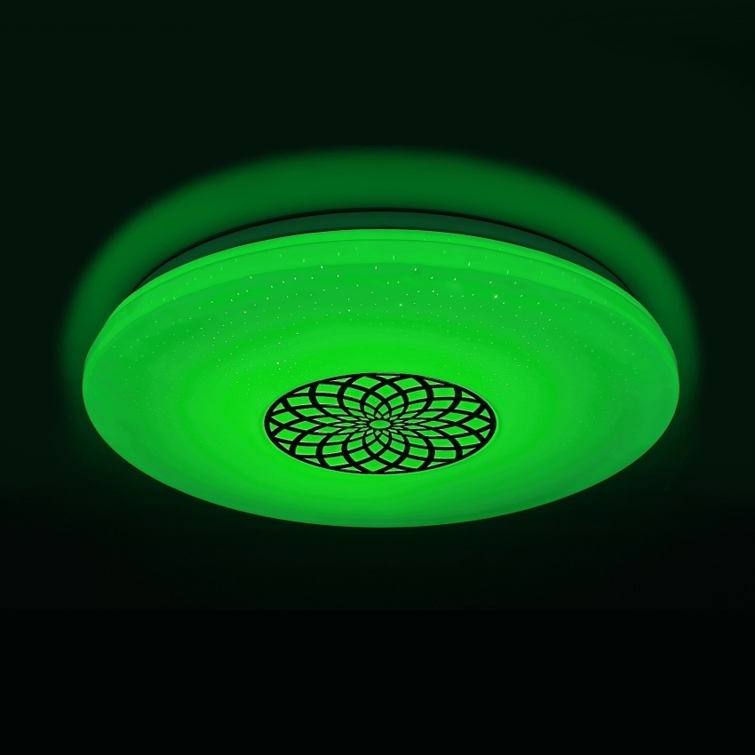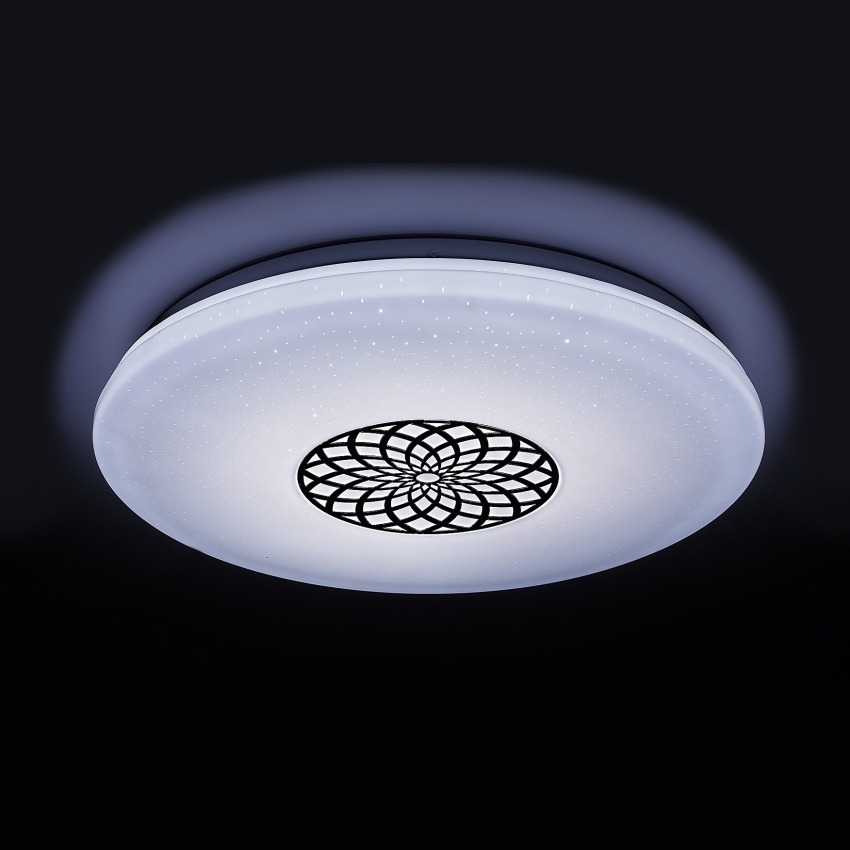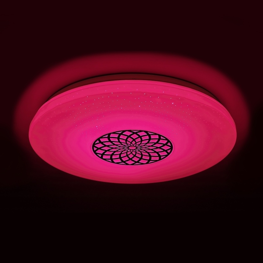 Moderní kulaté stropní svítidlo Ophelia pro jeho několik doplňkových funkcí doporučujeme do obývacího pokoje, ložnice nebo pracovny. Kovové svítidlo chromové barvy je doplněno o bílé plastové stínidlo s hvězdným efektem. Stínidlo je zdobeno vzorem připomínajícím mandalu. Svítidlo Ophelia obsahuje vestavěný LED světelný zdroj s výkonem 24 W, světelným tokem 2 000 lumenů a životností 25 000 hodin. Barevnou teplotu tohoto svítidla lze nastavit v rozmezí 3 000-6 500 K, t.j. můžete nastavit teplé, přirozené nebo studené bílé světlo. Kromě toho si můžete zvolit RGB osvětlení a svítidlo je stmívatelné, tudíž lze regulovat jeho jas. Svítidlo Ophelia má také časovač, paměť a funkci nočního osvětlení. Všechny extra funkce lze nastavit pomocí WiFi aplikace nebo dálkového ovladače. Průměr tohoto inteligentního stropního svítidla je 395 mm, vzdálenost od stropu je 65 mm. Na tento model poskytujeme 5letou záruku.