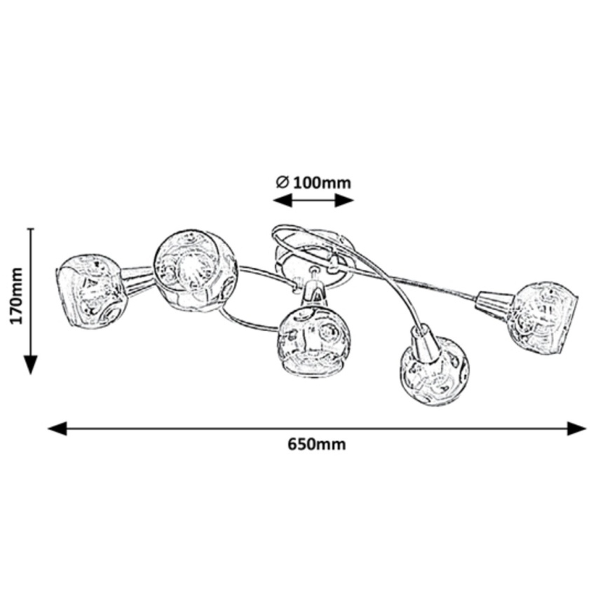 Bodové svítidlo Tamara s 5 žárovkami v moderním stylu bude krásným a elegantním kouskem zařízení vašeho obývacího pokoje nebo ložnice. Kovové svítidlo v chromové barvě je doplněno tónovanými skleněnými stínídly. Svítidlo lze připevnit na strop pomocí kulatého ozdobného podstavce. Chromovaný dekorativní podstavec je zakryt černým předním panelem a pět hlav svítidla hledících v různých směrech dodává světlo zo svítidla Tamara do každé části místnosti. Světlo je záhadně filtrované ze svítidla přes tónované sklo zaoblených stínítek, které jsou dole otevřené. Svítidlo Tamara může být použito s pěti žárovkami, každá s výkonem až 40W. Typ patice je E14. Pokud chcete vylepšit intimní a útulnou atmosféru v místnosti, vyberte si pro toto svítidlo teplé bílé světelné zdroje. Rozměry bodového svítidla Tamara s 5 žárovkami jsou následující: šířka 650 mm, vzdálenost od stropu 170 mm, průměr instalace 100 mm. Tento model se dodává bez světelných zdrojů.