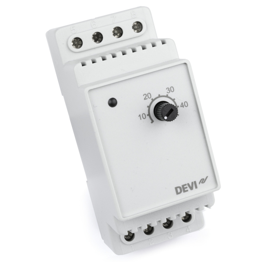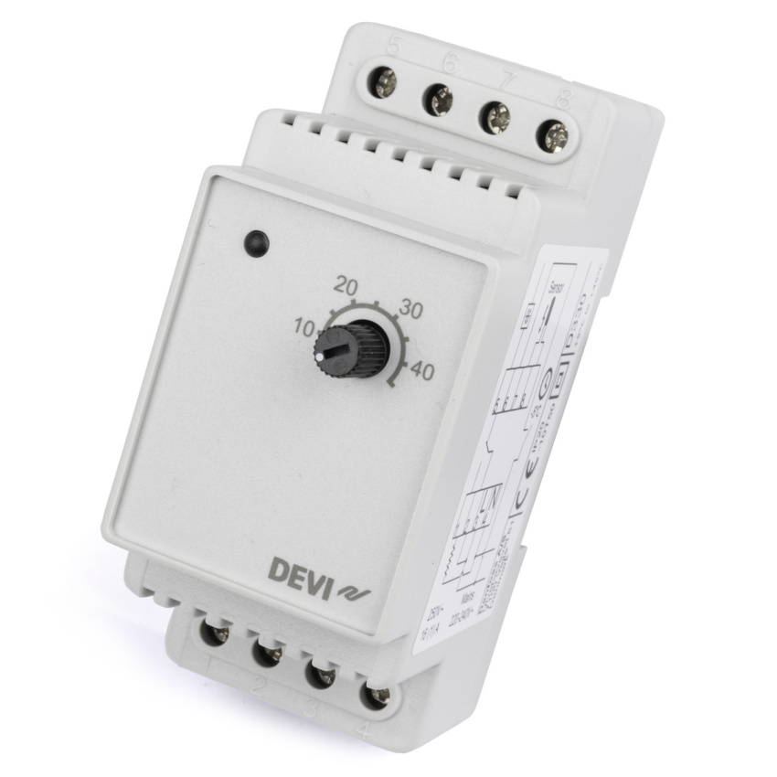 Elektronický termostat pro regulaci systémů vytápění/temperace potrubí a chladicích systémů, montáž na 35 mm DIN lištu, pracovní napětí: 220-240V, 50-60Hz, ohmické zatížení: 16/10A, třída krytí: IP 20, snímač NTC: 15kOhm při teplotě 25°C, teplotní rozsah: +5°C až +45°C