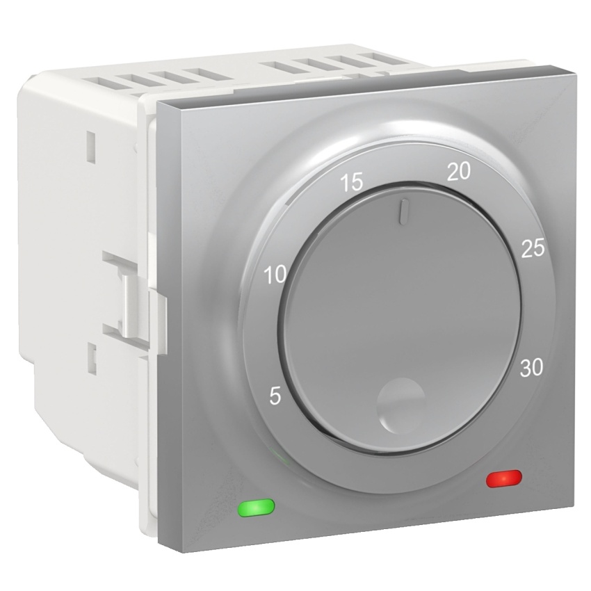 Schneider Electric Nová Unica pokojový termostat NU350130 je v barvě aluminium pro ovládání teploty Její odpovídající montážní krabice může být zapuštěna do povrchu stěny s montáží pod omítku. Má šířku 45 mm, výšku 45 mm, hloubku 47 mm a hloubku zapuštění 33 mm, Připojovací svorky tohoto pokojového termostatu jsou šroubovací. Kromě toho je stupeň krytí tohoto zařízení IP20. Tento pokojový termostat je vyroben z PC (polykarbonátu) GF10 FR, kovu a termoplastického materiálu stabilizovaného ABS-UV a je spolehlivý a odolný. A co víc, splňuje normu směrnice EMC, EN 60730-2-9, směrnice LV. Nová Unica zahrnuje sadu nových designů, barev a materiálů. Uživatelé mohou těžit z krásného designu, který odpovídá jejich stylu, a inovativních produktů. Nová Unica je navržena s chytrými funkcemi, které jsou flexibilní, snadno pochopitelné a rychle se instalují a poskytují řešení pro všechny požadavky zákazníků.