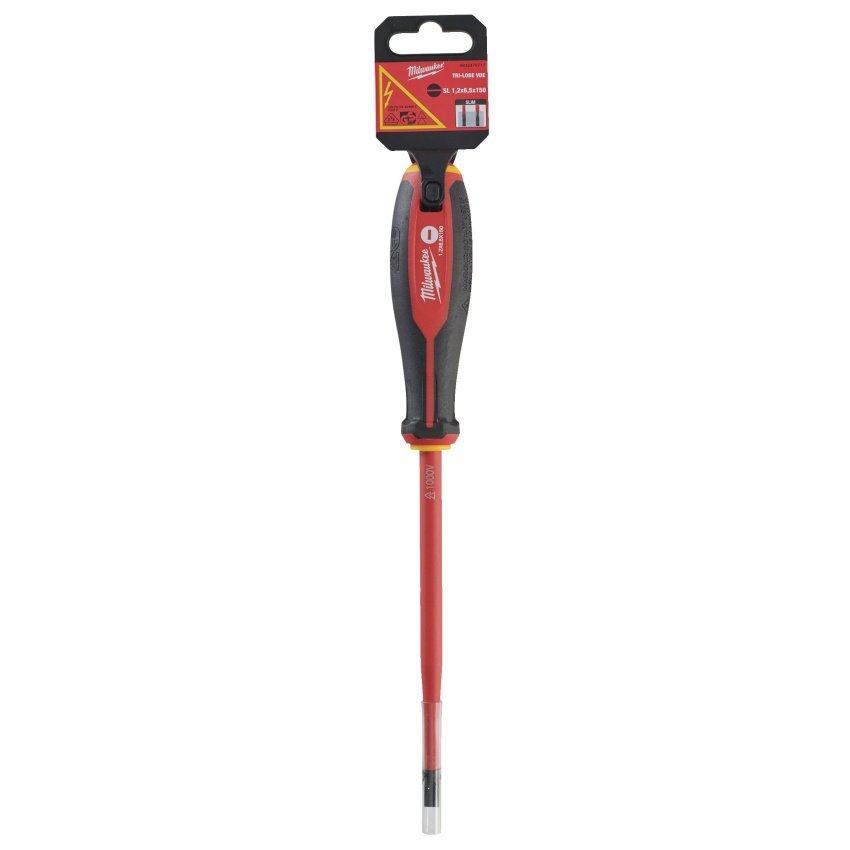 Šroubovák VDE Milwaukee Tri-Lobe SL testováno na 10 000 V a zaručeno na 1 000 V. Tenký průměr dříku pro přístup k nízko položeným šroubům.