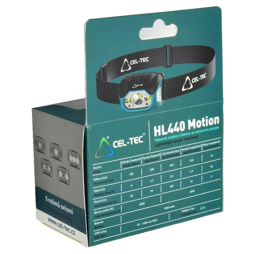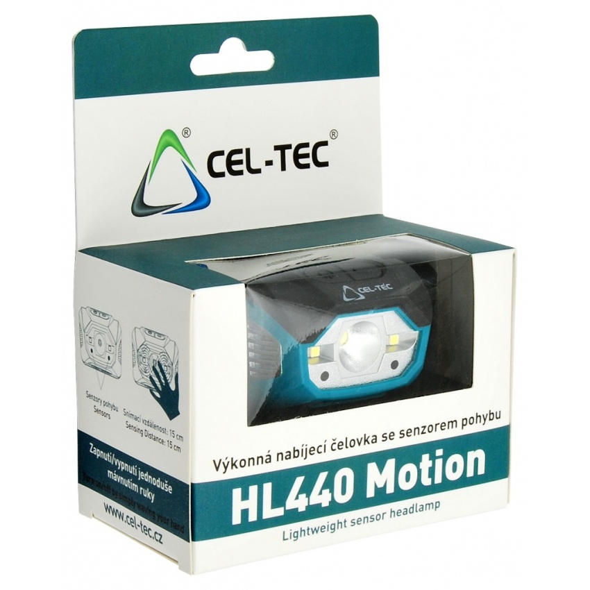 Nabíjecí čelovka CEL-TEC HL 440 Motion s pohybovým senzorem pro snadné zapnutí/vypnutí mávnutím ruky. Čelovka je osazena trojicí výkonných LED - 1x hlavní LED (CREE XPG-3) pro bodový svit a 2x boční LED pro rozptýlený svit. Maximální světelný výkon je 440 lm. Čelovka disponuje 5 režimy svícení a lze kombinovat bodový a rozptýlený svit. Samozřejmostí je nastavitelný sklon čelovky.