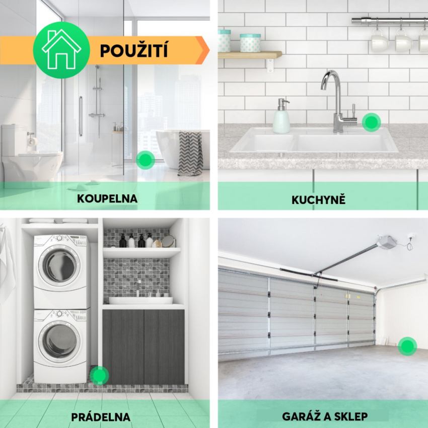 Zařízení lze umístit do koupelny, pod umyvadlo nebo vanu, k otevřeným oknům, k potrubí, pod střechu - všude tam, kde hrozí zaplavení nebo únik vody.
