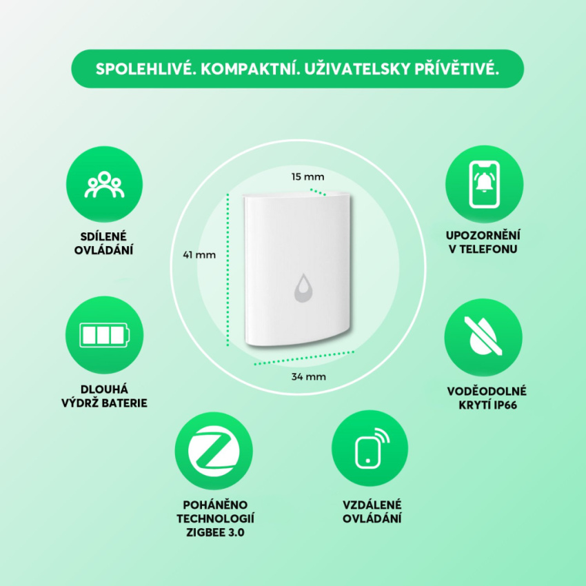 Bezdrátový senzor úniku vody je určen k detekci případů zaplavení místnosti vodou a včasného upozornění.