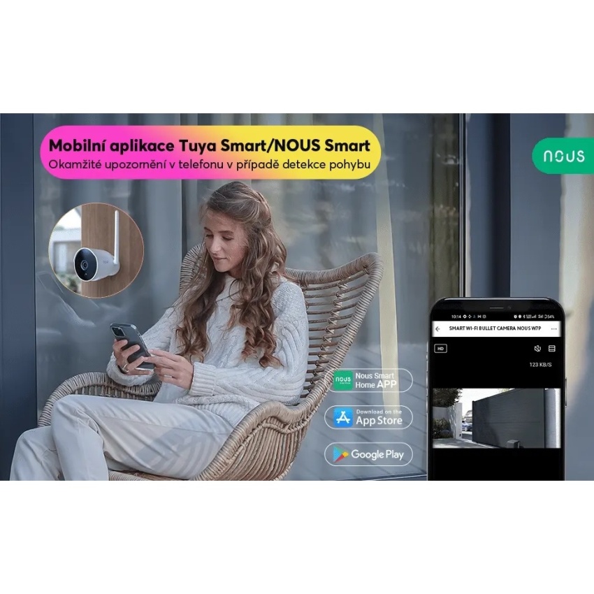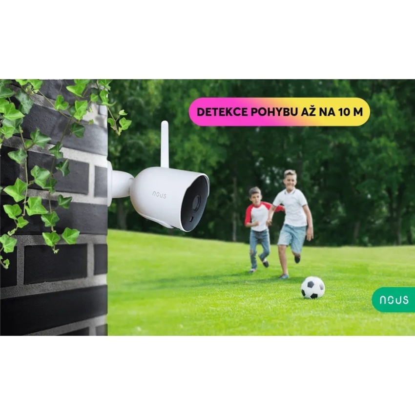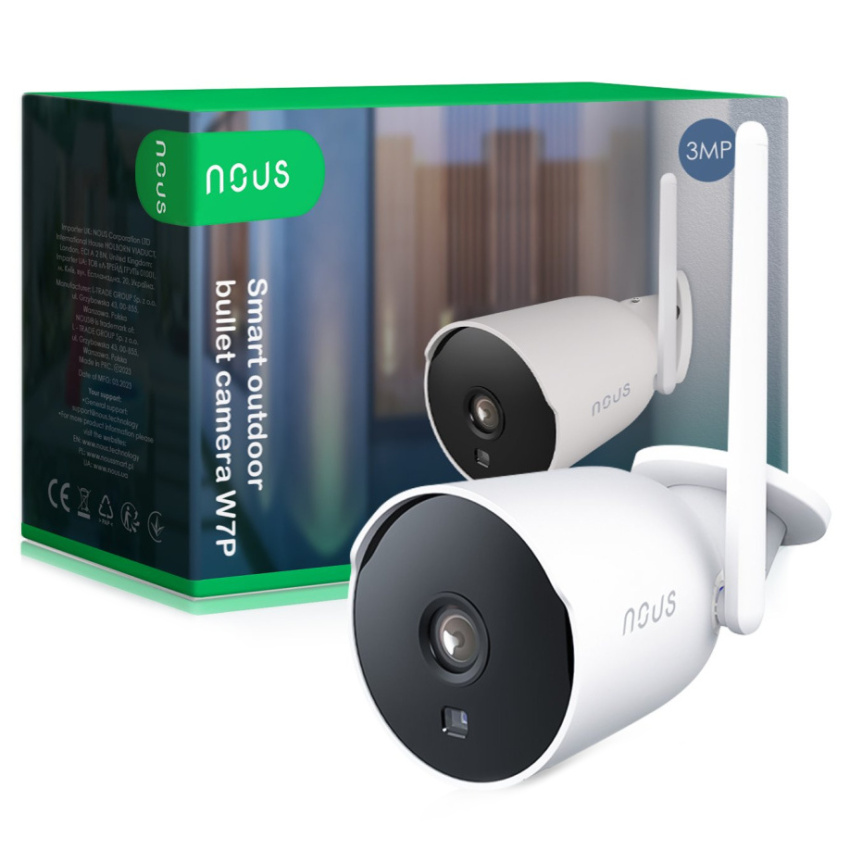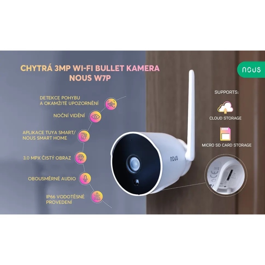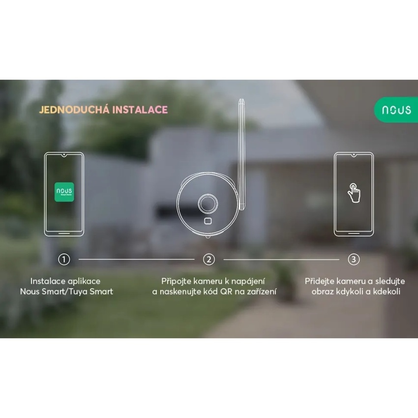 Venkovní chytrá 3MP WiFi kamera Nous W7P se snadno instaluje a připojuje k síti prostřednictvím WiFi. Pomocí aplikace Tuya Smart nebo aplikace Nous Smart si můžete prohlížet živé záznamy, přehrávat nahrávky a přijímat oznámení na svém chytrém telefonu. Můžete také komunikovat s návštěvníky nebo narušiteli prostřednictvím vestavěného mikrofonu a reproduktoru nebo spustit světelné a zvukové efekty, které je vystraší.