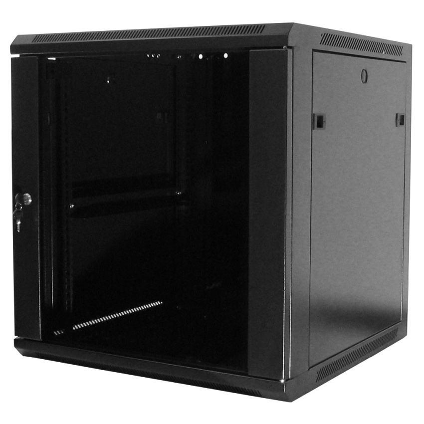 19“ nástěnný datový rozvaděč se skleněnými dveřmi, dodávaný ve smontovaném stavu. Pevná svařovaná konstrukce, skelet z ocelového plechu, černá prášková barva. Rozvaděč je dodávaný kompletně smontovaný. Skleněné dveře umožňují okamžitý přehled o stavu zařízení uvnitř rozvaděče. Vhodné pro malé sítě nebo koncová místa velkých sítí.