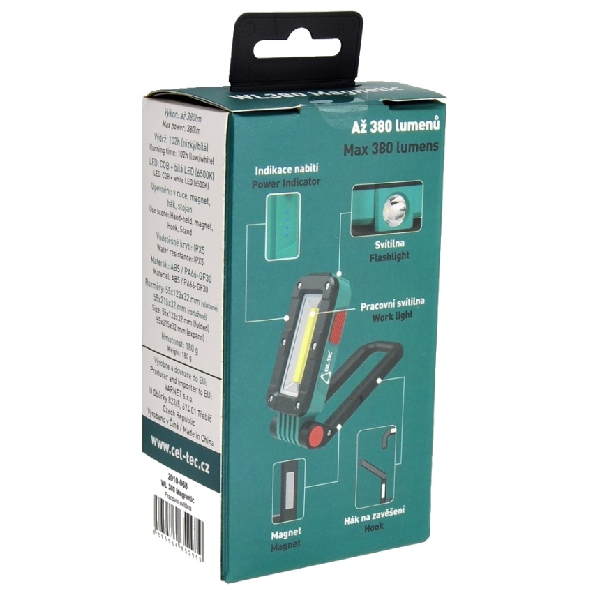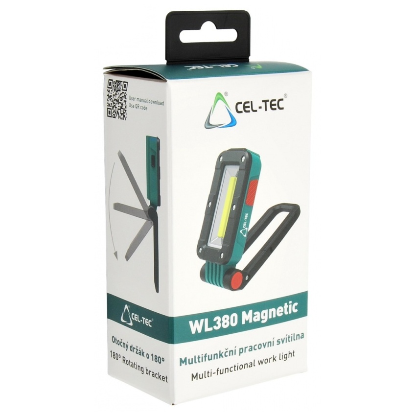 Multifunkční pracovní svítilna CEL-TEC WL380 Magnetic je vybavena nabíjecím akumulátorem, dvojicí LED světel (COB + bílá LED) o výkonu až 380 lm, LED indikací stavu baterie, magnetem a hákem na zavěšení. Vše v odolném, kompaktním a snadno použitelné provedení. Svítilna nalezne uplatnění při různorodých činnostech jako jsou například práce v domácnosti, opravy, kempování, řemeslné práce atd.