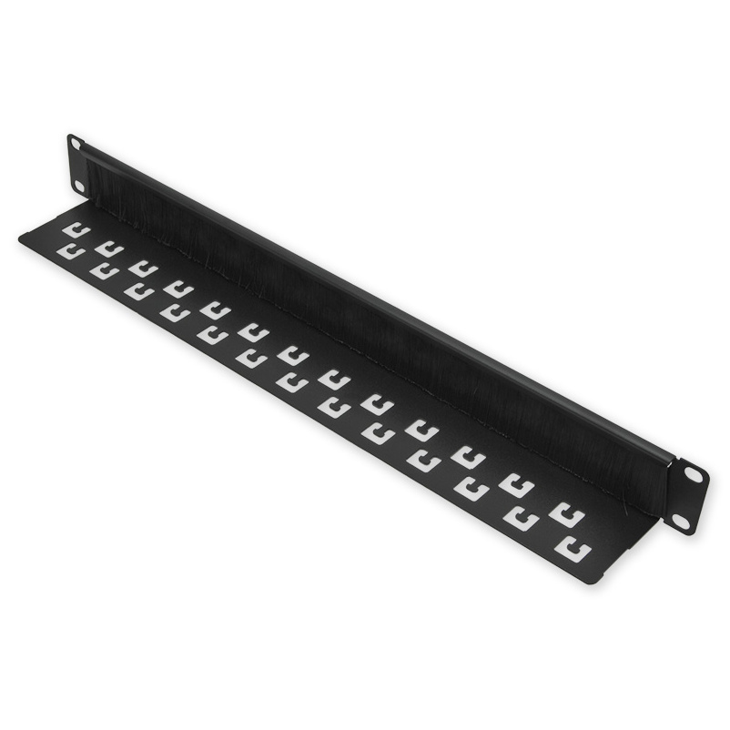Průchozí panel s kartáčem, výška 1U, černá barva.