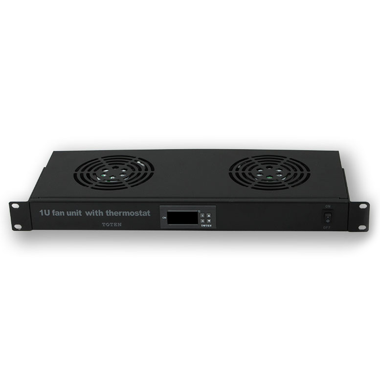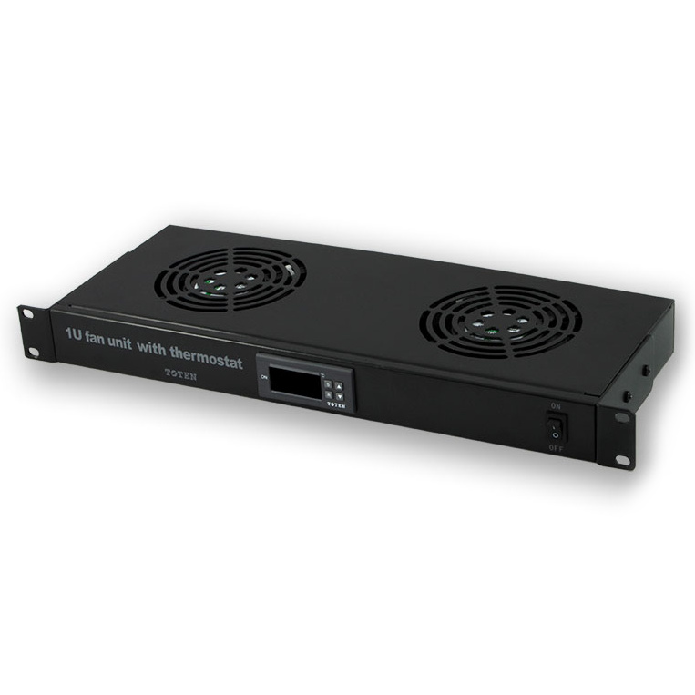 Samostatná ventilační jednotka 2 ventilátory s digitálním termostatem výšky 1U, černá barva.
