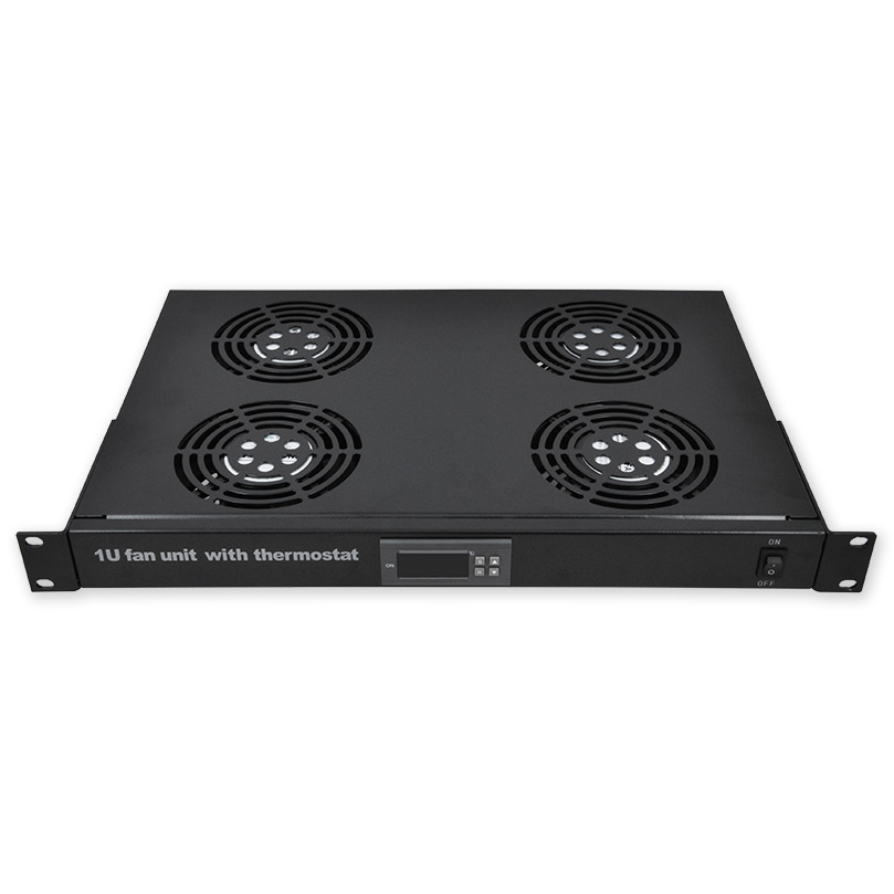 Ventilační jednotka 4 ventilátorů s digitálním termostatem pro 19" datové rozvaděče 1U, v černé barvě.