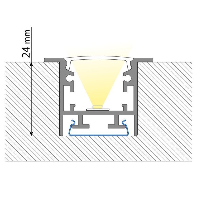 Tento hliníkový profil je určen k zapuštění do vybraného materiálu, zpravidla sádrokartonu. Speciální konstrukce tohoto profilu umožňuje snadné a zároveň pevné uchycení do podhledu pomocí speciálních kovových pérek, které nabízíme jako příslušenství.