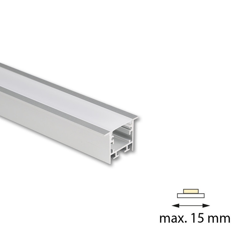 Hliníková základna k vestavnému profilu VF, bez difuzoru. Lze dokoupit mléčný difuzor. Tento profil je určen pro krytí a chlazení LED pásků do šíře až 15 mm a výkonu max. 28,8 W/m. Profil lze upevnit pomocí samostatně prodávaných kovových úchytů, nasouvacího kovového perka, případně jej lze přivrtat nebo přilepit. K profilu s difuzorem lze zakoupit také koncovky.