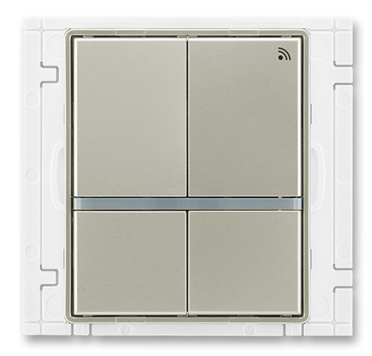 Vysílač radiofrekvenčního signálu čtyřtlačítkový pro nástěnnou montáž na obostrannou lepící pásku nebo pomocí vrutů. Při stisknutí jednotlivých částí hmatníku se vyšle odlišný kód a lze tak nezávisle ovládat dva až čtyři přijímače.