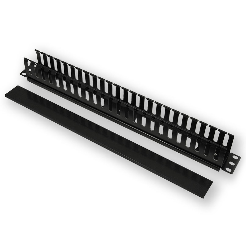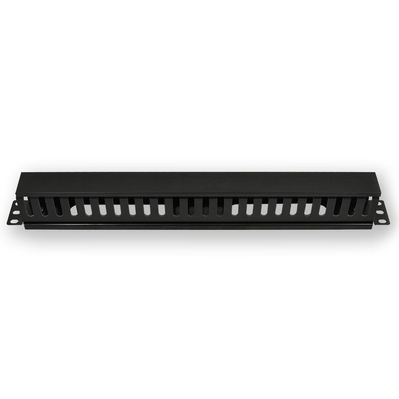 Vyvazovací plastový držák kabeláže, výška 1U, černá barva.