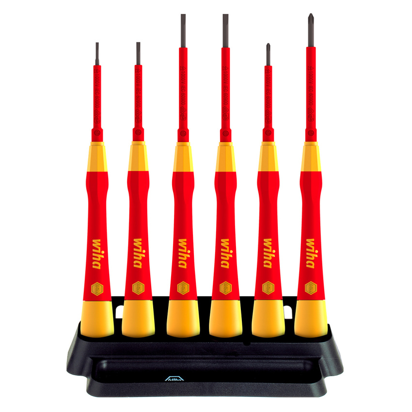Nároky u jemných mechanických šroubení spočívají v přesné a citlivé práci bez poškození obrobku. Jemné šroubováky PicoFinish společnosti Wiha jsou díky svým dlouhým, štíhlým rukojetím a částí pro rychlé otáčení ideální pro jemnou a přesnou práci v oblasti elektroniky a jemné mechaniky, rovněž i v oblasti kutilství a modelářství. Ergonomický design rukojeti s měkkou částí umožňuje komfortní práci. Citlivé a rychlé otáčení je podpořeno otočnou krytkou s lehkým chodem. Symboly natištěné na otočné krytce šroubováku usnadní výběr správného profilu šroubováku. Izolované jemné šroubováky jsou podrobeny kusové zkoušce podle mezinárodní normy IEC 60900 a umožňují bezpečnou práci v oblasti dílů pod napětím do 1 000 V AC. V sadě je obsaženo 6 jemných šroubováků PicoFinish a jeden držák. Díky držáku mohou být jemné šroubováky řádně uloženy na pracovišti.