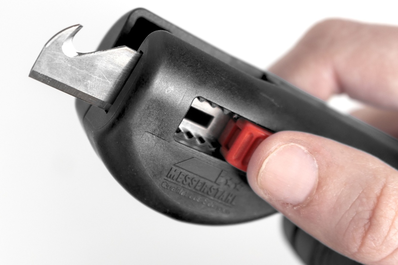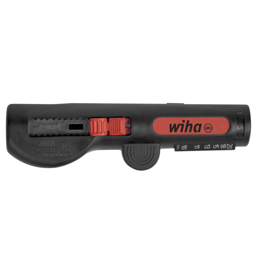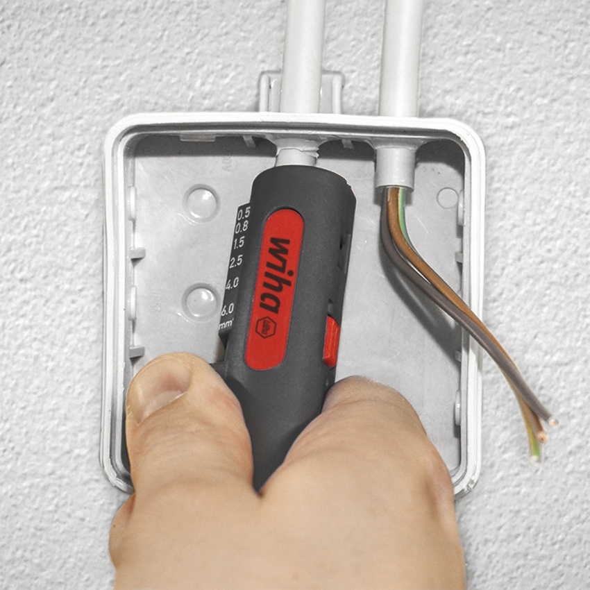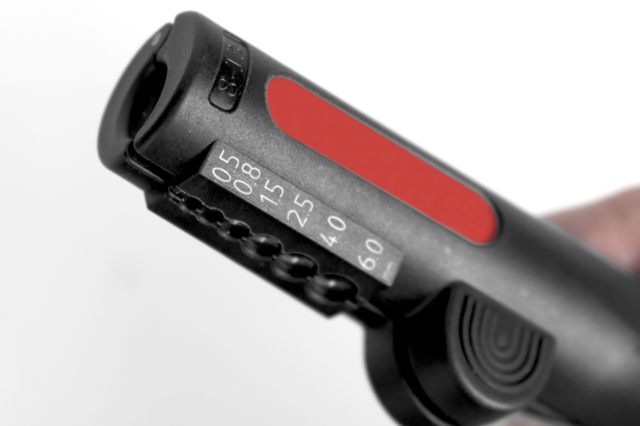 Při práci na skříňovém rozvaděči se ve stísněném prostoru provádí velký počet pracovních kroků. Multifunkční odizolovací nástroj Wiha pokrývá hned čtyři důležité funkce. Patří mezi ně odplášťování kruhových kabelů sprůměrem 8–13mm (3× 1,5mm? až 5× 2,5mm?) kruhovým apodélným řezem. Optimalizované vedení kabelu zajišťuje bezpečné, přesné apohodlné odpláštění bez nutnosti předem nastavovat hloubku řezu. Rovné odpláštění není díky pohodlné aprotiskluzové rukojeti nejmenší problém ani na obtížně přístupných místech. Víceúčelový nástroj kromě toho zaručuje čisté odizolování flexibilních imasivních vodičů vrozsahu 0,5–6,0mm?. Integrovaný hákový dřík lze bezpečně aretovat ana ochranu úplně zapustit do tělesa. Za účelem bezpečného aprostorově nenáročného uskladnění je možné odizolovací nástroj zajistit vzavřeném stavu.