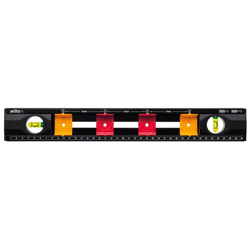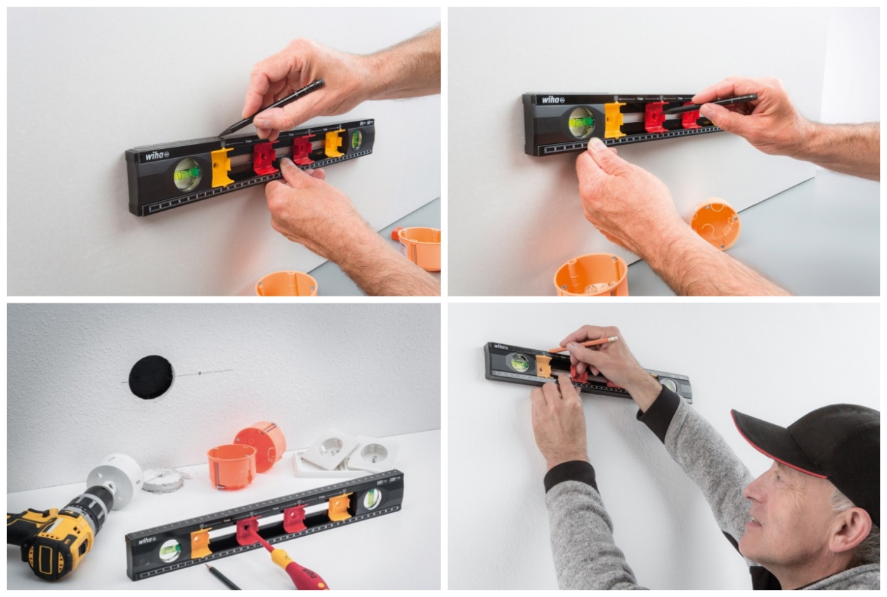 Právě při instalaci zásuvkových krabice na podlaze to má elektromechanik často těžké, protože nemůže dobře vidět libelu na vodováze. Navíc při vyznačování na základě prohlubní libely často vznikají nepěkné zářezy. Nyní elektromechanici s touto vodováhou Wiha udělají konec všem těmto problémovým případům. Dokonce i u ostrých zorných úhlů je možný perfektní náhled na libely. K tomu účelu vodováha díky průběžnému pouzdru umožňuje nepřerušované vyznačování linií. Dokonce i při pohledu shora je pomocí rafinovaně napolohovaných stupnic možné komfortní kótování. Další výhodu při elektroinstalaci nabízí variabilní značení vzdálenosti až pro 4 krabice pod omítku. Díky posuvným značkovacím bodům pro krabice může být vodováha přizpůsobena příslušným značkovacím vzdálenostem v závislosti na specifikaci dané země, a tím může být různými způsoby a mezinárodně používána. Díky svému kompaktnímu tvaru je navíc velmi vhodná k mobilnímu použití a může být pohodlně uschována v kufru pro elektromechaniky.