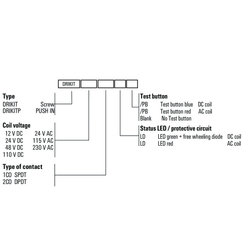 DRIKITP 230VAC 2CO LD/PB paticové relé, 2 přepínací kontakt, 5A/250VAC AgSnO, LED indikace červená, test.tlač. ANO, patice šroubová, š=15,8mm (2576150000)