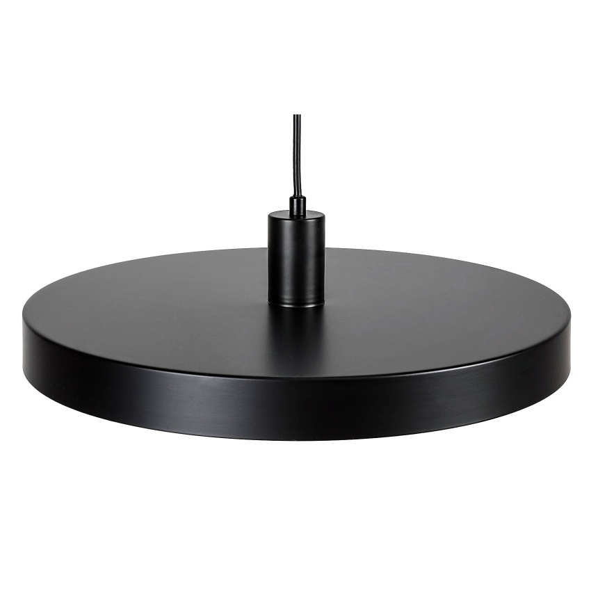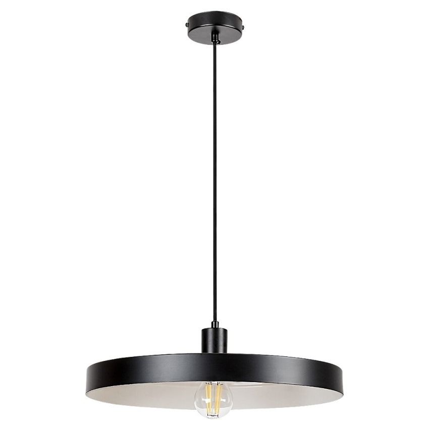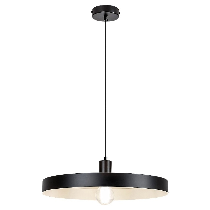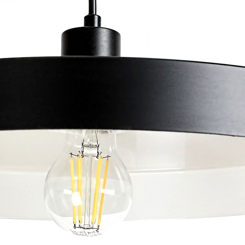 Alatar - Lustr Alatar v industriálním stylu může být charakteristickým kusem nábytku v moderním obývacím pokoji nebo jídelně. Matná černá lampa vyrobená výhradně z kovu je doplněna o kulaté stínítko ve tvaru talíře, které je zvenčí matně černé a zevnitř bílé.