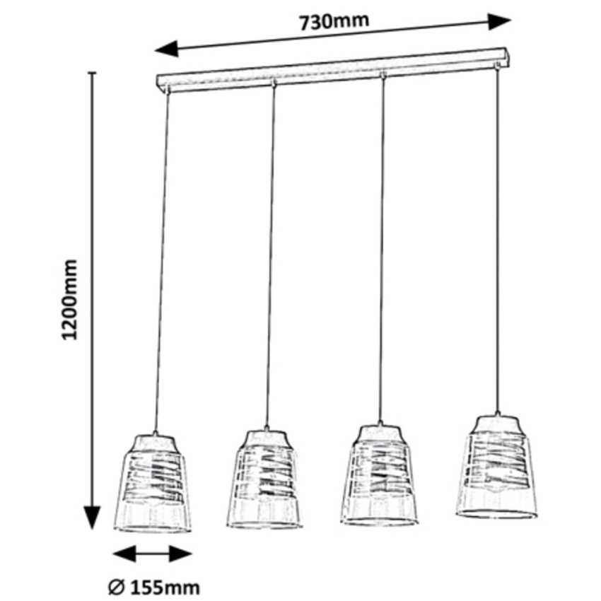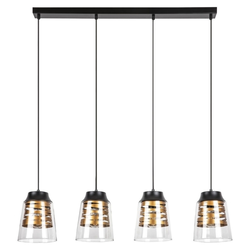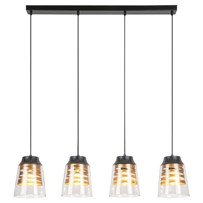 Moderní závěsné svítidlo Zenaida se 4 žárovkami bude útulným doplňkem k zařízení vašeho moderního obývacího pokoje, ložnice, jídelny nebo dokonce kuchyně. Matné černé svítidlo vyrobené z kovu je doplněno průhlednými skleněnými stínítky, z nichž každý má uvnitř světelný zdroj, který má zlatou stužkovou výzdobu. Toto závěsné svítidlo lze připevnit na strop pomocí dlouhého čtvercového ozdobného podstavce. Hlavy svítidla jsou spojeny s ozdobnou paticí textilními kabely. Každá hlava svítidla Zenaida je jako velkolepá a lahodná kávová specialita naplněna ve sklenici s dvojitým sklem, která visí vzhůru nohama na stěně. Tento model je možné použít se čtyřmi žárovkami, z nichž každá má výkon až 60W. Typ patice je E27. Pokud chcete vylepšit intimní a útulnou atmosféru, vyberte si pro toto svítidlo teplé bílé světelné zdroje. Rozměry závěsného svítidla se 4 žárovkami jsou tyto: šířka 730 mm, průměr každého stínítka je 155 mm, vzdálenost od stropu 1 200 mm. Tento model se dodává bez světelných zdrojů.